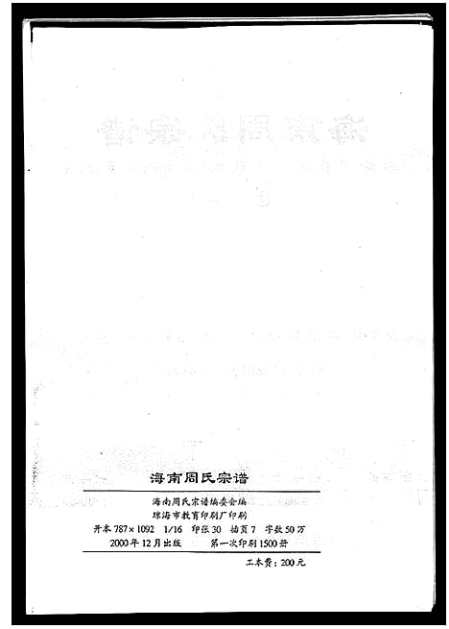 海南周氏宗谱编委会,2000年续修(琼海市教育印刷厂),1册 :插图,世系表,肖像