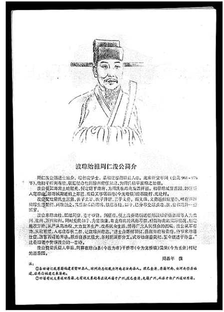 渡琼始祖 :(宋) 周仁浚,任琼州知府,由福建莆田徙琼,生三子 :周义田,周开圻,周义勇,本谱为开圻公世系,后裔析置琼山,定安,海口,临高等地
